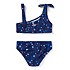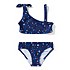Fun in the sun awaits. She'll love swimming in this printed two-piece set, featuring an asymmetrical crop top with a tie shoulder and matching bikini. Made from chlorine-resistant fabric for durability, this style is finished with stay-put leg grippers for worry-free movement and Block the burn UPF 50+ sun protection.