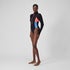 Take style and performance to another level wearing this streamlined long-sleeve swimsuit, featuring a zip-up front, colour-block panels and stylish cut-out back. Suitable for workouts in the pool and outdoors, it?s oil and suncream resistant and includes a shelf bra with removable bra pads for shape and support. Regular workouts are no match for our new ultra-chlorine-resistant fabric. It includes XLANCE® technology with two-way stretch for a long-lasting performance fit.
