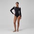On the board, in the ocean, wherever your adventure takes you. Our versatile new Long-Sleeve Zip-Back one piece flexes to your environment so you can explore new horizons. A waterproof back zipper with a bonded zip pull makes changing easy. Flattering tonal panels, a high neckline and a boyleg design deliver a streamlined aesthetic. Rest easy, knowing the durable fabric resists chlorine and pilling. Designed with a handy back zip pocket and a full mesh lining to promote water flow.